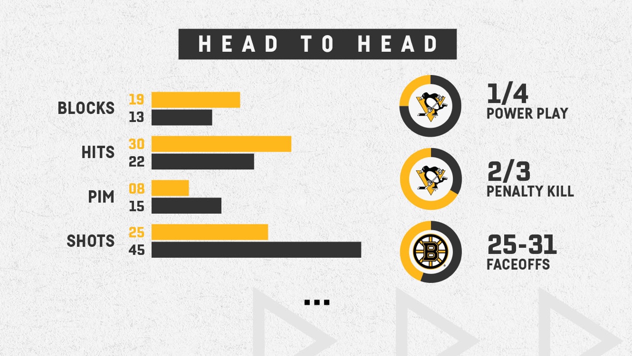 Spotkanie nie rozpoczęło się dla Pingwinów dobrze. Po pierwszej tercji Pens przegrywali 2:0 po bramkach Pastrnaka. W drugiej odsłonie Heinen jednak popisał się dwoma trafieniami w przeciągu minuty i błyskawicznie doprowadził do wyrównania. Bramka Crosby'ego w przewadze pod koniec drugiej tercji wysunęła Pens na prowadzenie, którego zespół z Pittsburgha nie oddał już do końca meczu.
